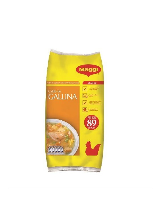 El Caldo de Gallina MAGGI® está elaborado con una cuidadosa selección de ingredientes de altos estándares de calidad y frescura, más sustancia y sabor a Gallina dejando las comidas deliciosas sin ser hostigantes, se disuelve fácilmente. Es libre de grasas Trans y Colesterol, tiene un bajo aporte de calorías por porción. Sus colorantes son 100% naturales y contiene la sal requerida para las diferentes preparaciones, por lo tanto no necesita adicionarle más.